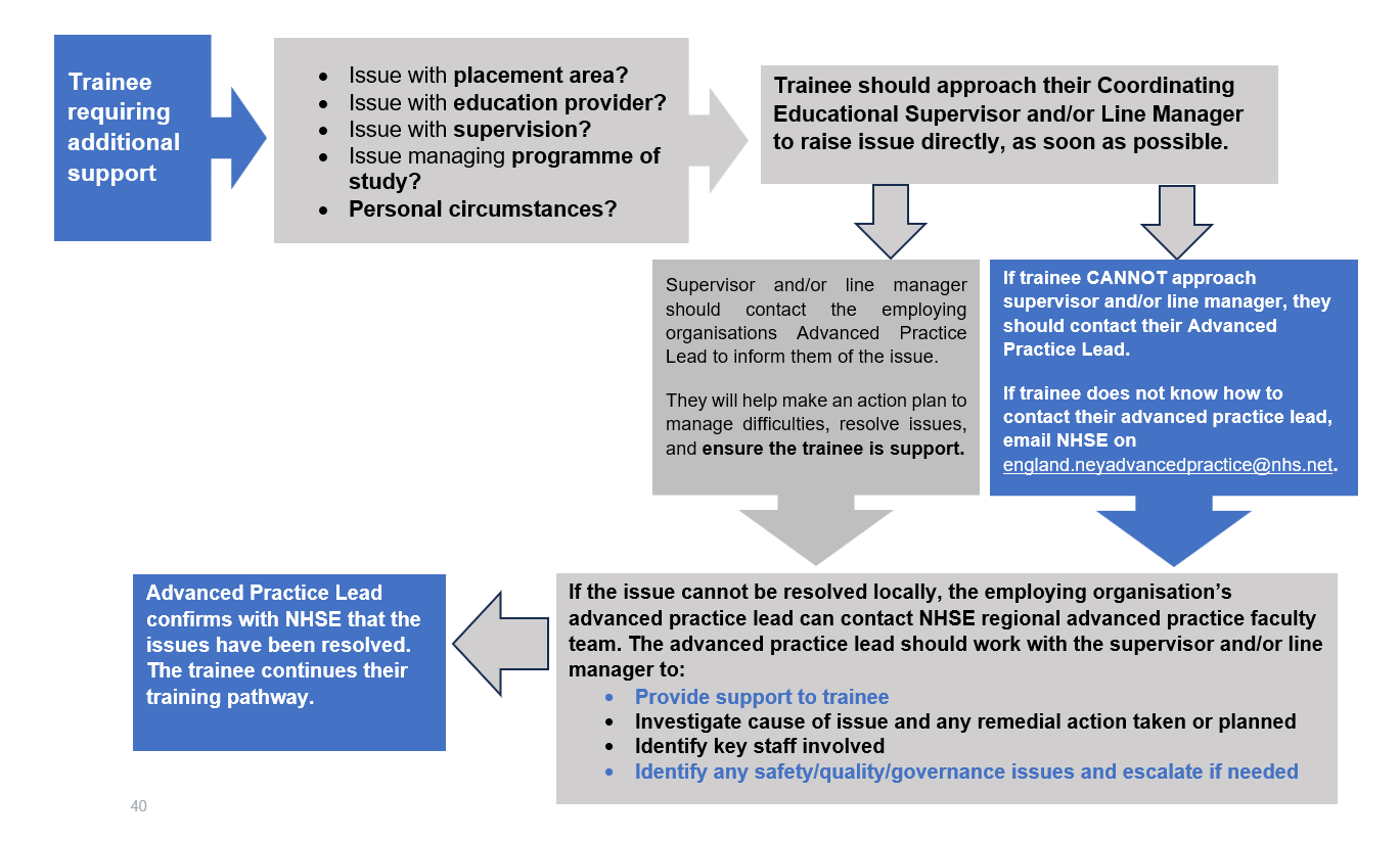 Trainee: If there is a concern with regards to the HEI programme, the trainee should raise the issue with their coordinating educational supervisor. If there are concerns around the education and support from their coordinating educational supervisor, the trainee should approach their advance practice lead, clinical lead, or line manager.